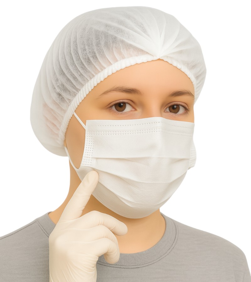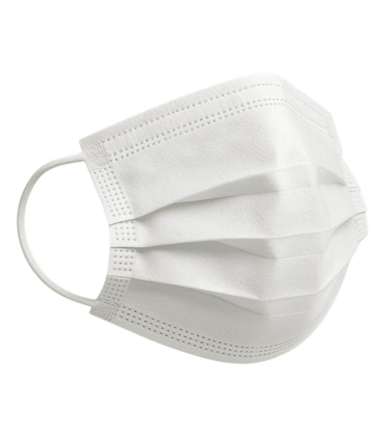 Máscaras triplas descartáveis com elástico confeccionadas inteiramente em tecido não tecido. Possuem três camadas, com acabamento em toda a extremidade por soldagem eletrônica pontilhada. Duas camadas (externa e interna) em TNT e uma camada de filtro meltblown. Eficiência de Filtração Bacteriana igual ou maior que 95%. Três pregas de tamanho ajustável, que protegem do nariz ao queixo, protegendo as conformações faciais.