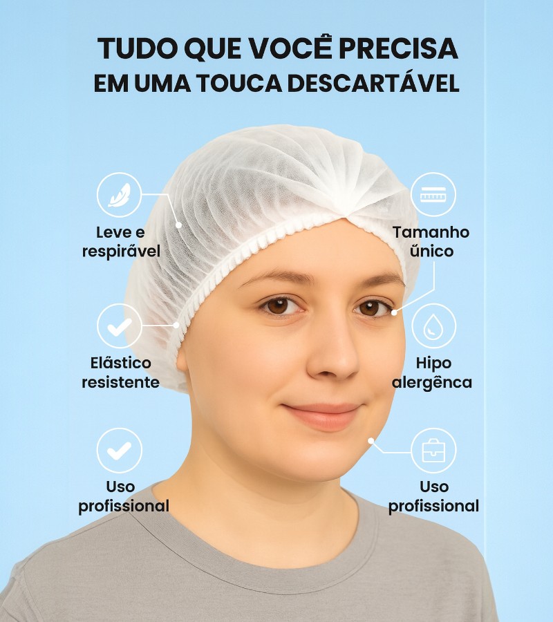 A Touca Descartável com Elástico Duplo VDESC é a escolha ideal para quem busca proteção, higiene e conforto em diversas atividades do cotidiano. Fabricada em TNT leve e respirável, oferece ótimo ajuste à cabeça graças ao elástico duplo, que garante firmeza sem apertar.